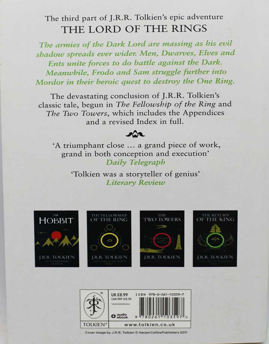 Read MoreConcluding the story begun in The Hobbit, this is the final part of Tolkien's epic masterpiece, The Lord of the Rings. Featuring a striking black cover based on Tolkien's own design, the definitive text, and a detailed map of Middle-earth. The armies of the Dark Lord are massing as his evil shadow spreads ever wider. Men, Dwarves, Elves and Ents unite forces to do battle agains the Dark. Meanwhile, Frodo and Sam struggle further into Mordor in their heroic quest to destroy the One Ring. Impossible to describe in a few words, JRR Tolkien's great work of imaginative fiction has been labelled both a heroic romance and a classic fantasy fiction. By turns comic and homely, epic and diabolic, the narrative moves through countless changes of scene and character in an imaginary world which is totally convincing in its detail. Tolkien created a vast new mythology in an invented world which has proved timeless in its appeal.