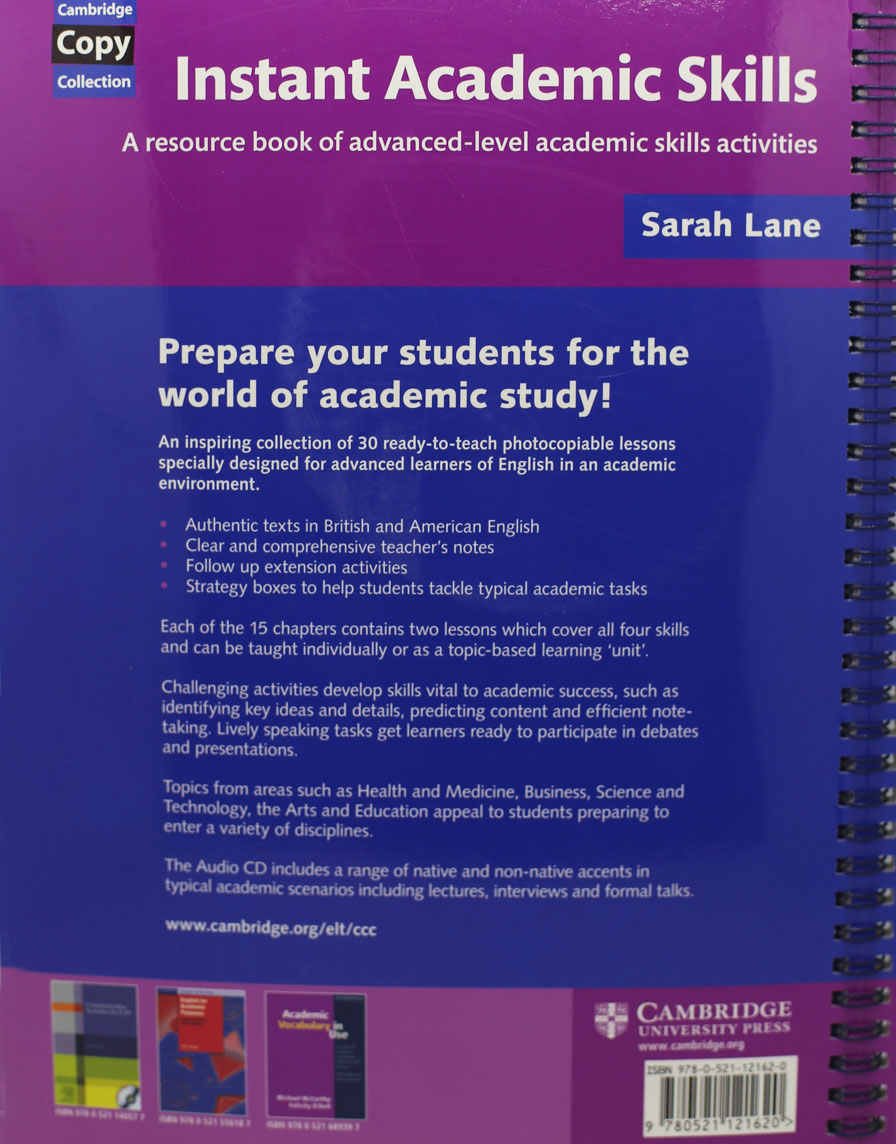 A photocopiable resource book for teachers of English for Academic Purposes. Instant Academic Skills provides ready-to-teach, photocopiable lessons for busy teachers who want to give their students extra practice in general academic skills. The lessons cover all four skills (listening, speaking, reading and writing) and can be taught individually or as a learning 'unit'. Challenging activities develop skills vital to academic success such as identifying key ideas and details, predicting content and efficient note-taking, while lively speaking tasks get learners ready to participate in debates and presentations. The Audio CD includes a variety of native and non-native accents in typical academic scenarios such as lectures, interviews and formal talks.