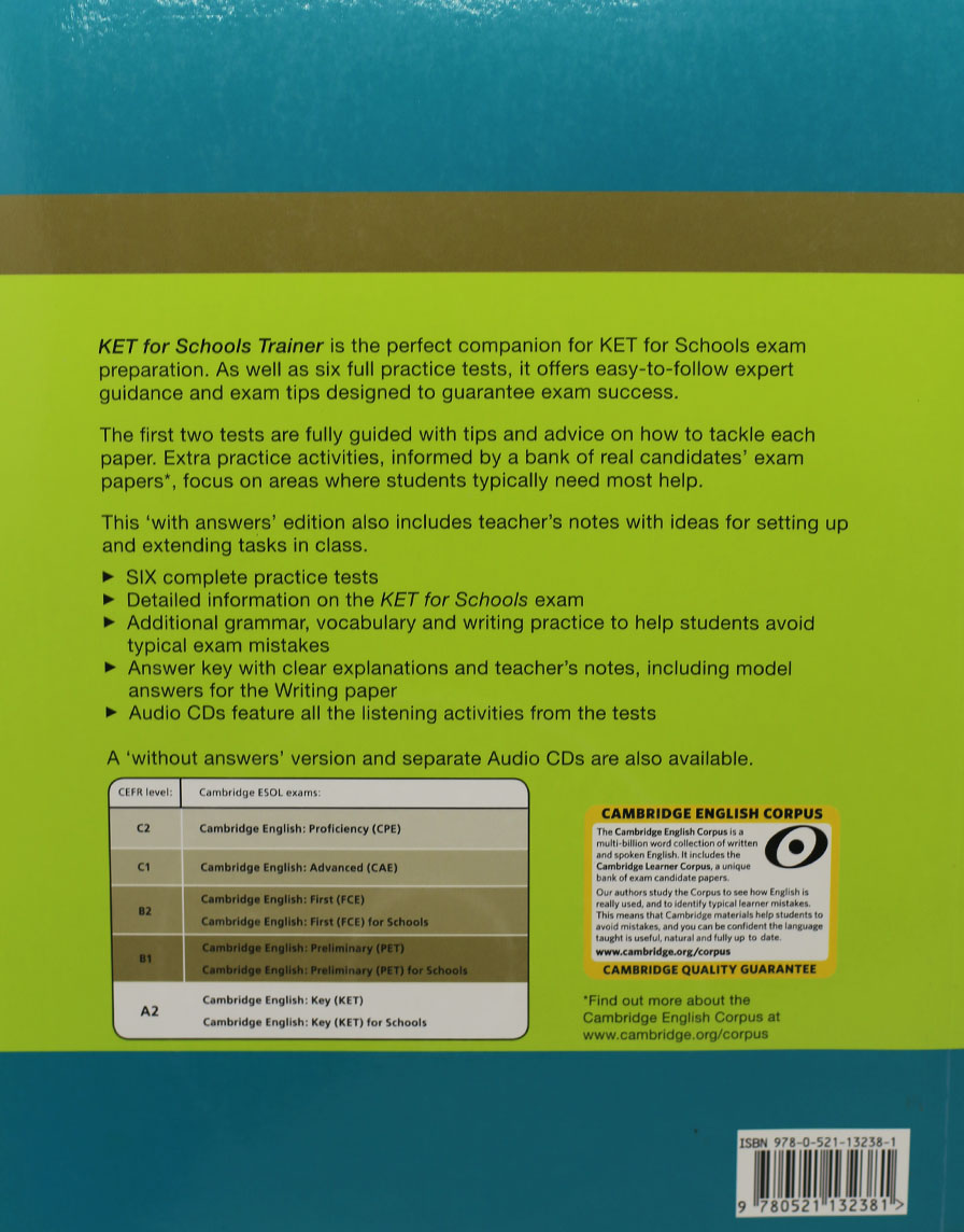 Six full practice tests plus easy-to-follow expert guidance and exam tips designed to guarantee exam success. As well as six full practice tests, KET for Schools Trainer offers easy-to-follow expert guidance and exam tips designed to guarantee exam success. The first two tests are fully guided with step-by-step advice on how to tackle each paper. Extra practice activities, informed by the Cambridge Learner Corpus, a bank of real candidates' exam papers, focus on areas where students typically need the most help. This 'with answers' edition also includes teacher's notes as well as audio CDs featuring all the listening activities from the tests, and an explanatory key with model answers for the Writing paper.