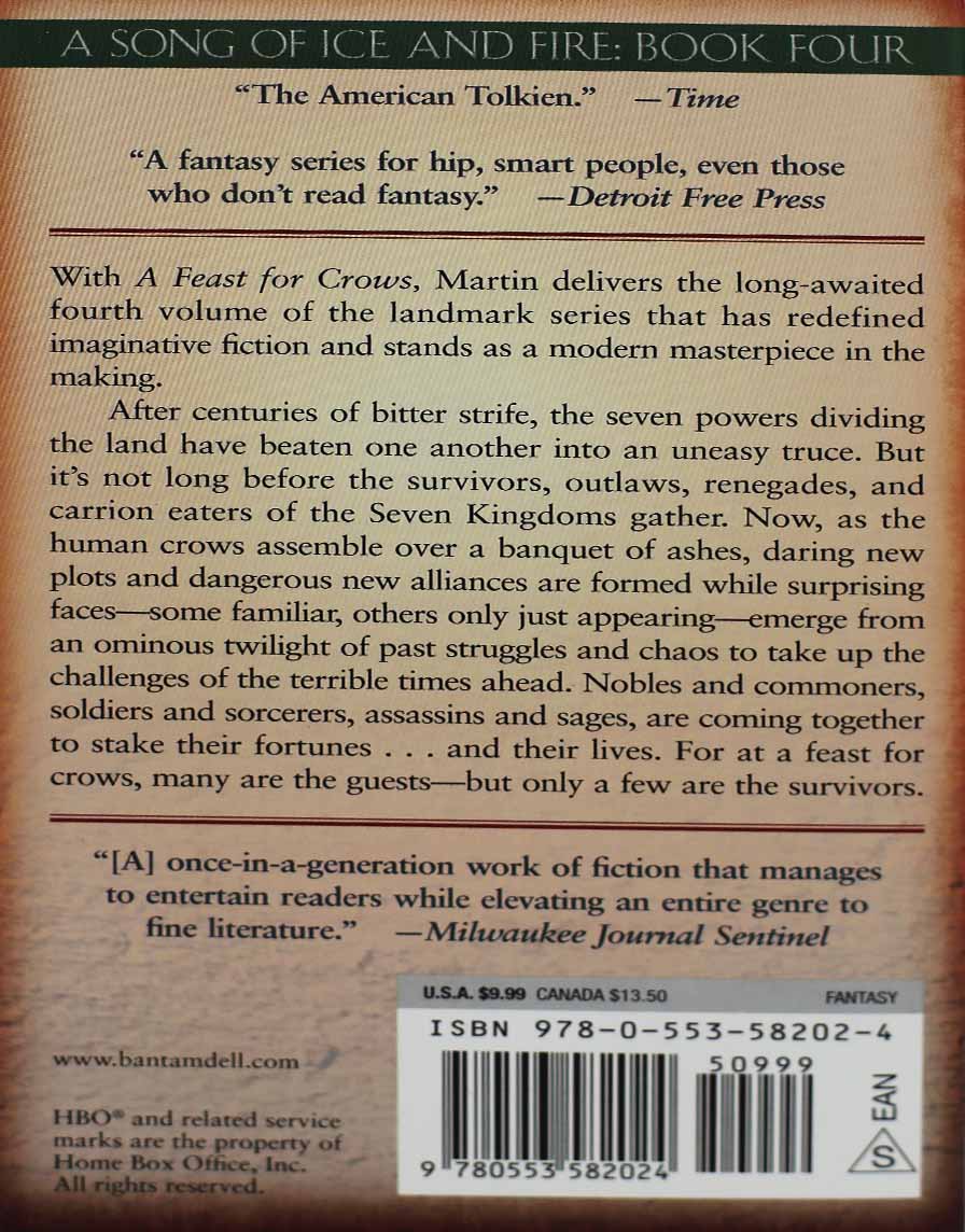 Read MoreTHE BOOK BEHIND THE FOURTH SEASON OF THE ACCLAIMED HBO SERIES GAME OF THRONES Few books have captivated the imagination and won the devotion and praise of readers and critics everywhere as has George R. R. Martin's monumental epic cycle of high fantasy. Now, in A Feast for Crows, Martin delivers the long-awaited fourth book of his landmark series, as a kingdom torn asunder finds itself at last on the brink of peace . . . only to be launched on an even more terrifying course of destruction. A FEAST FOR CROWS It seems too good to be true. After centuries of bitter strife and fatal treachery, the seven powers dividing the land have decimated one another into an uneasy truce. Or so it appears. . . . With the death of the monstrous King Joffrey, Cersei is ruling as regent in King's Landing. Robb Stark's demise has broken the back of the Northern rebels, and his siblings are scattered throughout the kingdom like seeds on barren soil. Few legitimate claims to the once desperately sought Iron Throne still exist--or they are held in hands too weak or too distant to wield them effectively. The war, which raged out of control for so long, has burned itself out. But as in the aftermath of any climactic struggle, it is not long before the survivors, outlaws, renegades, and carrion eaters start to gather, picking over the bones of the dead and fighting for the spoils of the soon-to-be dead. Now in the Seven Kingdoms, as the human crows assemble over a banquet of ashes, daring new plots and dangerous new alliances are formed, while surprising faces--some familiar, others only just appearing--are seen emerging from an ominous twilight of past struggles and chaos to take up the challenges ahead. It is a time when the wise and the ambitious, the deceitful and the strong will acquire the skills, the power, and the magic to survive the stark and terrible times that lie before them. It is a time for nobles and commoners, soldiers and sorcerers, assassins and sages to come together and stake their fortunes . . . and their lives. For at a feast for crows, many are the guests--but only a few are the survivors.