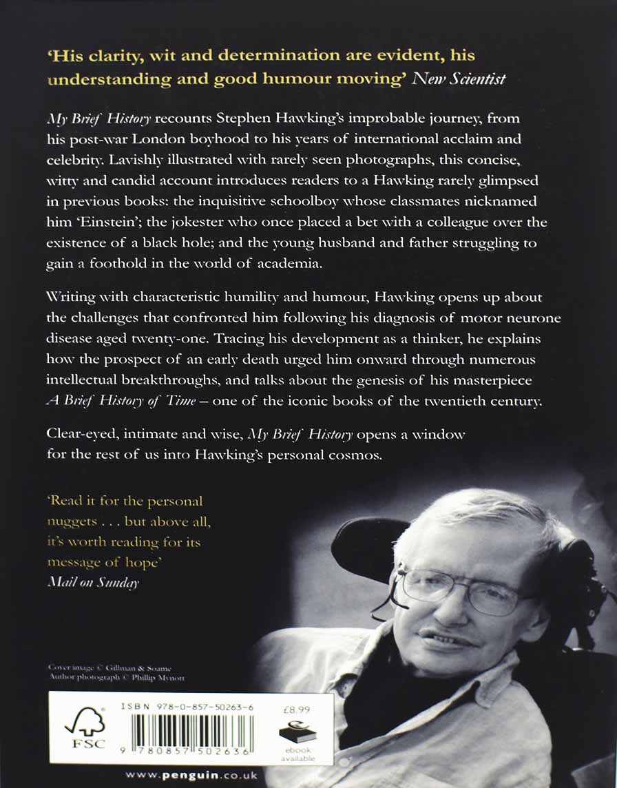 Read MoreHis clarity, wit and determination are evident, his understand and good humour moving' New Scientist My Brief History recounts Stephen Hawking's improbable journey, from his post-war London boyhood to his years of international acclaim and celebrity. Lavishly illustrated with rarely seen photographs, this concise, witty and candid account introduces readers to a Hawking rarely glimpsed in previous books: the inquisitive schoolboy whose classmates nicknamed him `Einstein'; the jokester who once placed a bet with a colleague over the existence of a black hole; and the young husband and father struggling to gain a foothold in the world of academia. Writing with characteristic humility and humour, Hawking opens up about the challenges that confronted him following his diagnosis of motor neurone disease aged twenty-one. Tracing his development as a thinker, he explains how the prospect of an early death urged him onwards through numerous intellectual breakthroughs, and talks about the genesis of his masterpiece A Brief History of Time - one of the iconic books of the twentieth century. Clear-eyed, intimate and wise, My Brief History opens a window for the rest of us into Hawking's personal cosmos. 'Read it for the personal nuggets . . . but above all, it's worth reading for its message of hope' Mail on Sunday