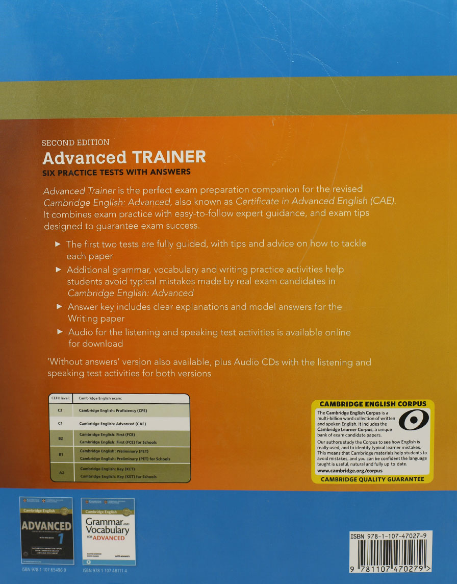 Six full practice tests with tips and training for the 2015 revised Cambridge English: Advanced (CAE). Advanced Trainer Second edition offers six practice tests for the revised Cambridge English: Advanced (CAE) exam combined with easy-to-follow guidance and exam tips. The first two tests are fully guided with advice on how to tackle each paper. Extra practice activities, informed by the Cambridge Learner Corpus, a bank of real candidates' exam papers, focus on areas where students typically need the most help. This version contains a full answer key. Audio for the listening and speaking test activities is available online for download. Audio CDs featuring the listening material are also available, separately.
