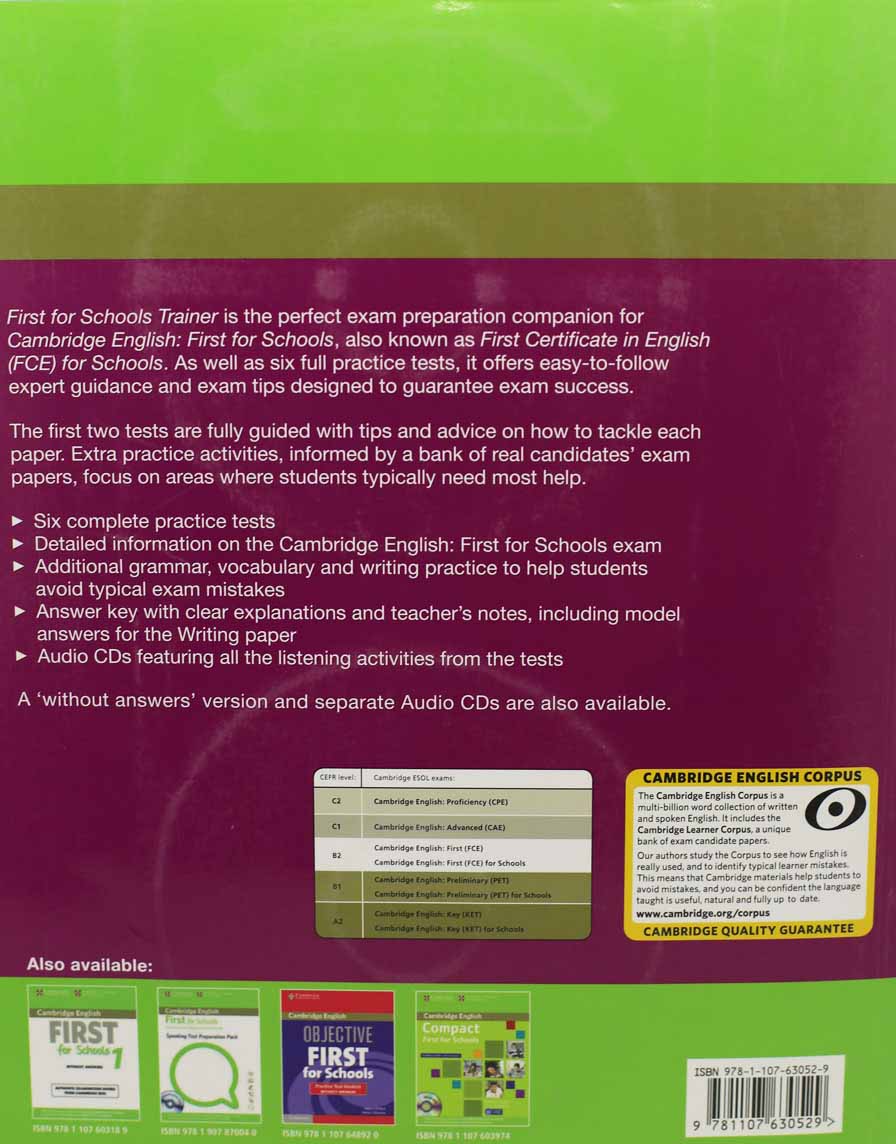 Six full practice tests plus easy-to-follow expert guidance and exam tips for Cambridge English: First for Schools The syllabus for this exam has changed and this book has now been replaced by 9781107446045 First for Schools Trainer Second edition Six Practice Tests without Answers with Audio.