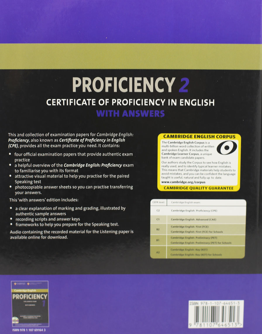 Cambridge English Proficiency 2 contains four complete and authentic examination papers for Cambridge English: Proficiency, also known as Cambridge Certificate of Proficiency in English (CPE). This collection of examination papers provides the most authentic exam preparation available. They allow candidates to familiarise themselves with the content and format of the examination and to practise useful examination techniques. This Student's Book with answers includes Audio, downloadable from the website. The Student's Book with answers contains a clear explanation of marking and grading, authentic sample answers, transcripts, and frameworks to help with thorough preparation for the Speaking test. The downloadable Audio files contain the exam Listening material. Audio CDs and a Student's Book with or without answers are also available separately.