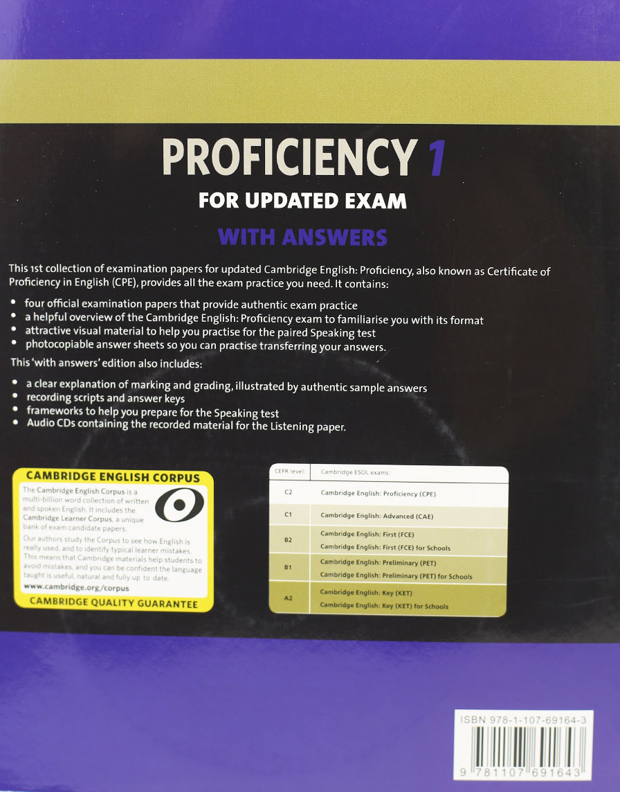 Cambridge English Proficiency 1 for updated exam (commencing March 2013) contains four complete and authentic examination papers for Cambridge English Proficiency, also known as Cambridge Certificate of Proficiency in English (CPE). This collection of examination papers provides the most authentic exam preparation available. They allow candidates to familiarise themselves with the content and format of the examination and to practise useful examination techniques. This pack contains the Student's Book with answers and Audio CDs. The Student's Book with answers contains a clear explanation of marking and grading, authentic sample answers, transcripts, and frameworks to help with thorough preparation for the Speaking test. The CDs contain the exam Listening material. The Audio CDs and Student's Book with or without answers are also available separately.
