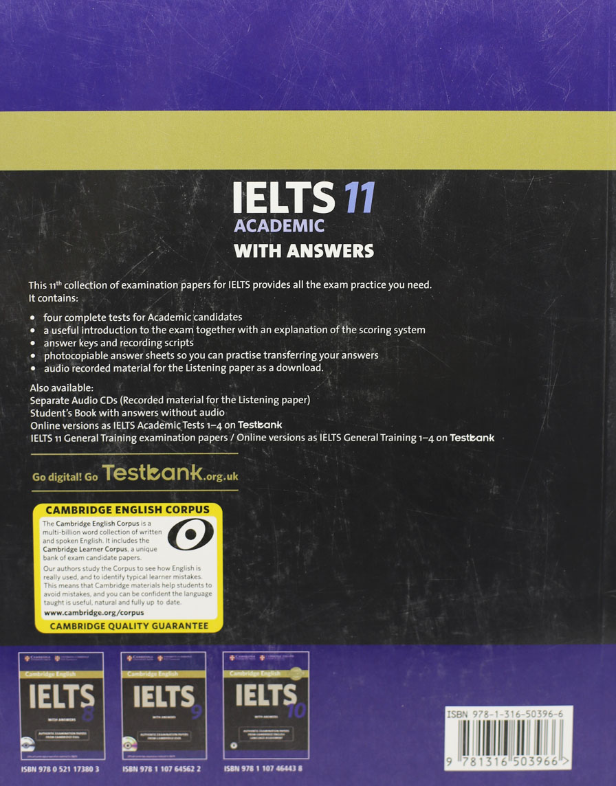 Authentic examination papers from Cambridge Assessment English provide perfect practice because they are EXACTLY like the real test. IELTS 11 Academic delivers FOUR complete examination papers plus details of the different parts of the test and the scoring system, so you familiarise yourself with the test format and practise your exam technique. The book comes with answers, tape scripts and sample writing answers. Use the access code on the inside front cover to download the audio for the Listening tests. These tests are also available as IELTS Academic Tests 1-4 on Testbank.org.uk.