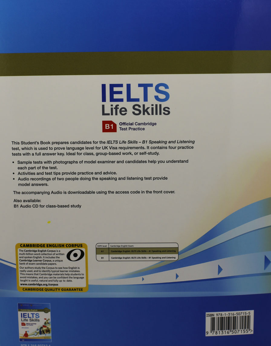 Official preparation for the 'IELTS Life Skills' Speaking and Listening exam This Student's Book prepares candidates for the IELTS Life Skills - A1 Speaking and Listening exam which is used to prove language level for UK Visa requirements. It includes four practice tests for the exam with a full answer key. There is an introduction to the exam with information about what to expect and guidelines for teachers on how to assess students. There are model Speaking answers, practice exercises and exam tips to support candidates. The accompanying Audio is downloadable using an access code in the book. Audio CDs are also available separately for class use.