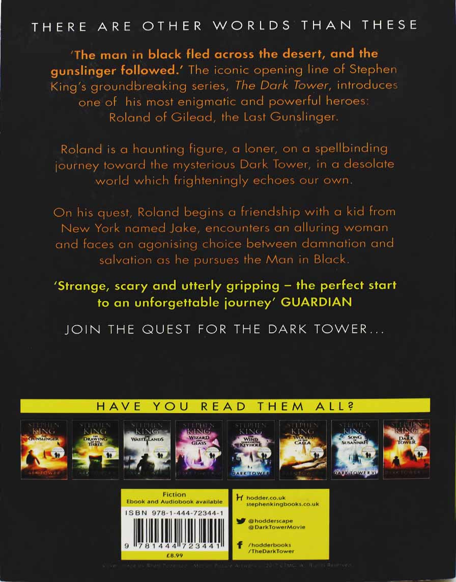 Read MoreThe Dark Tower is now a major motion picture starring Matthew McConaughey and Idris Elba. 'The man in black fled across the desert, and the gunslinger followed.' The iconic opening line of Stephen King's groundbreaking series, The Dark Tower, introduces one of his most enigmatic and powerful heroes: Roland of Gilead, the Last Gunslinger. Roland is a haunting figure, a loner, on a spellbinding journey toward the mysterious Dark Tower, in a desolate world which frighteningly echoes our own. On his quest, Roland begins a friendship with a kid from New York named Jake, encounters an alluring woman and faces an agonising choice between damnation and salvation as he pursues the Man in Black.