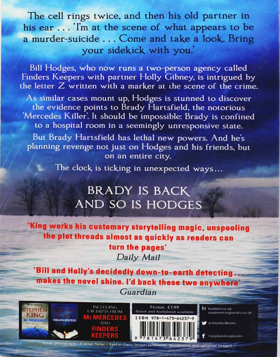 Read MoreThe cell rings twice, and then his old partner in his ear . . . 'I'm at the scene of what appears to be a murder-suicide . . . Come and take a look. Bring your sidekick with you.' Bill Hodges, who now runs a two-person agency called Finders Keepers with partner Holly Gibney, is intrigued by the letter Z written with a marker at the scene of the crime. As similar cases mount up, Hodges is stunned to discover the evidence points to Brady Hartsfield, the notorious 'Mercedes Killer' who they helped to convict. It should be impossible: Brady is confined to a hospital room in a seemingly unresponsive state. But Brady Hartsfield has lethal new powers. And he's planning revenge not just on Hodges and his friends, but on an entire city. The clock is ticking in unexpected ways... BRADY IS BACK. AND SO IS HODGES. The extract above is abridged from End of Watch.