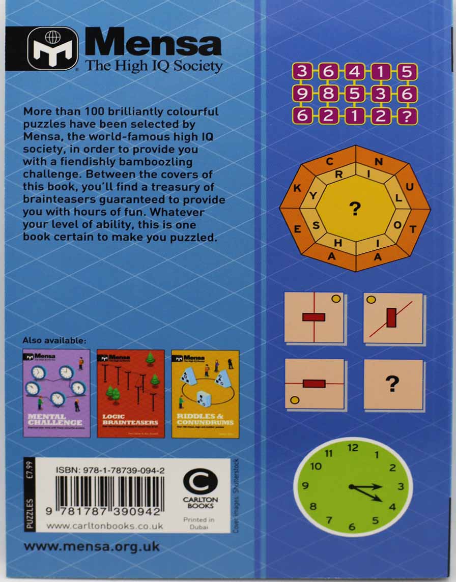 Read MoreExercise your mind with this fabulous selection of 100 full-colour puzzles from Mensa, the world-famous high IQ society. Between the covers of this book you'll find a treasury of brain-teasers such as visual puzzles, games and riddles, all graded in difficulty, to tax the mind. This book is guaranteed to provide you with hours of fun, all while you give your mind a wonderful workout .