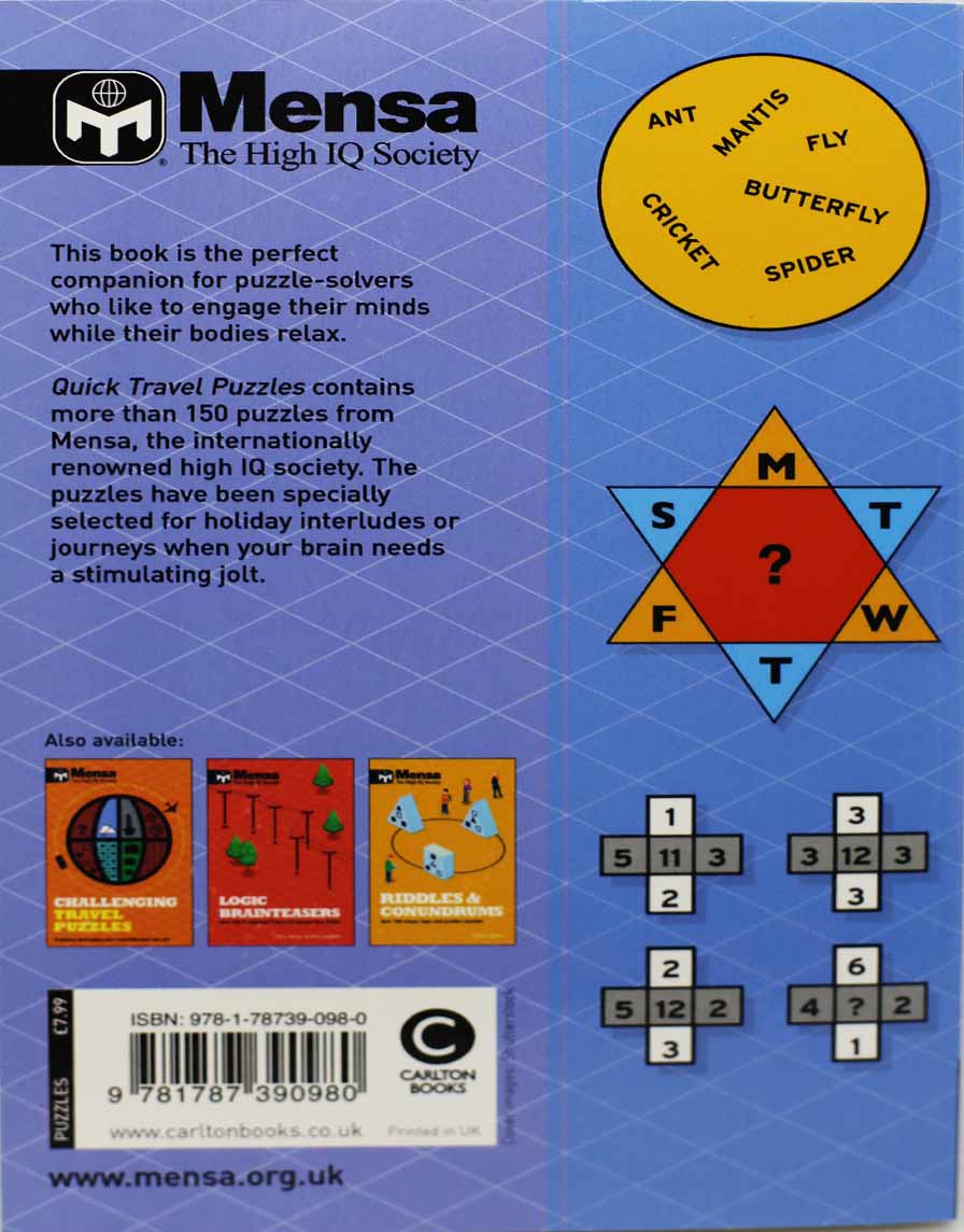 Mensa: Quick Travel Puzzles brings the challenge of Mensa to you every day for your journey or vacation with a book of puzzles specially designed for you to take on any trip. These 150 quick puzzles can be solved wherever you may find yourself with a few minutes to spare. There are all sorts of challenges and special quizzes, and the emphasis in this book is on puzzles that you can solve quickly!