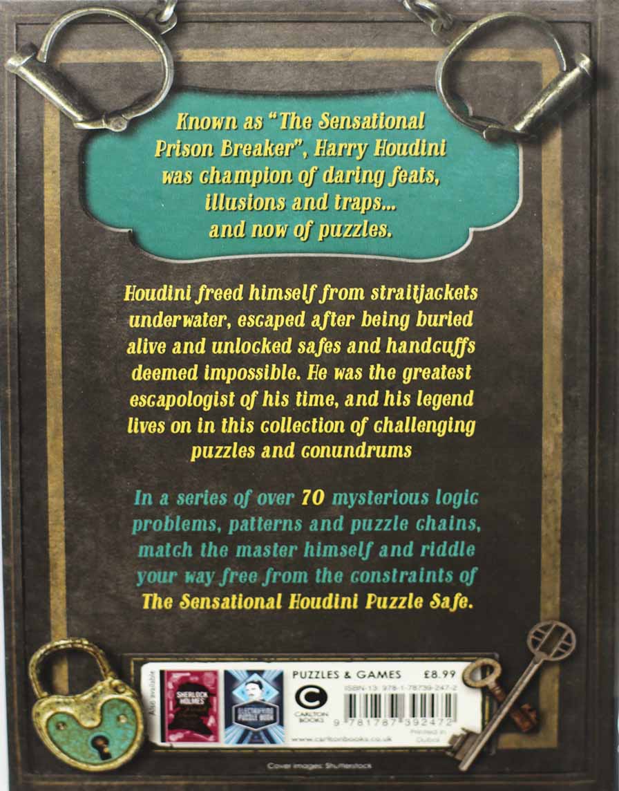 The Sensational Houdini's Puzzle Safe contains 50 exciting puzzles inspired by the greatest escapologist to have ever lived. With puzzle chains where one wrong answer can leave you locked in a never-ending circle of puzzles, and logic problems designed to confound the minds of the unworthy, this puzzle book is an enjoyable test for all. Unlock your brain and see if you can escape the challenges inside.
