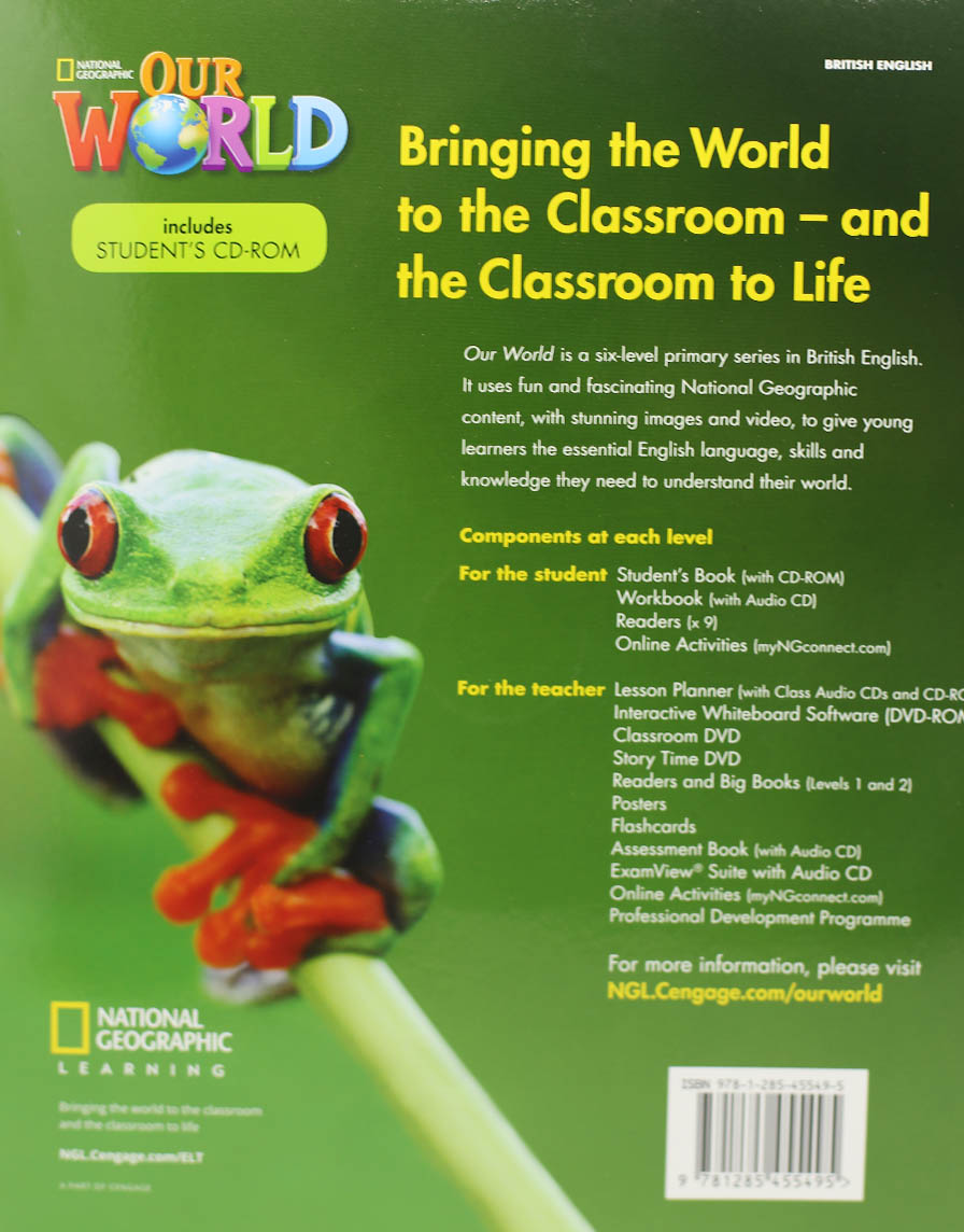 Our World is a balanced four-skills series with age-appropriate National Geographic content that motivates and excites young learners of English and helps them use English as a tool to learn about and interact with the world. Perfect for the content-rich classroom, Our World has everything students need for a balanced, four-skills curriculum, key grammar instruction, and important 21st century skills practice and cross-curricular exposure. - National Geographic video inspires and motivates young learners - Our World Readers encourage reading for fun, and bring storytelling into your classroom - Grammar support is flexible and varied with instruction and practice through the Workbooks, Grammar Workbooks, videos, and Lesson Planners - Free online activities and support are available for teachers and learners at myNGconnect.com and through the Our World Student App
