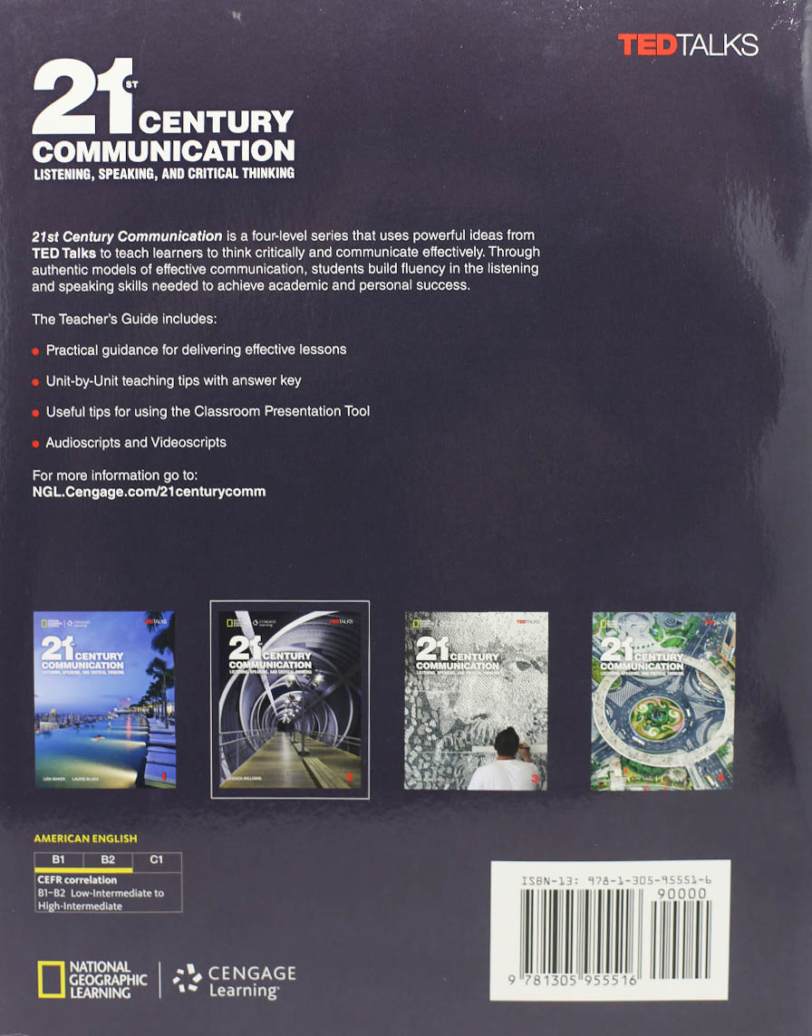 21st Century Communication is a four-level series that uses powerful ideas from TED Talks to teach learners to think critically and communicate effectively. Through authentic models of effective communication, students build fluency in the listening and speaking skills needed to achieve academic and personal success.