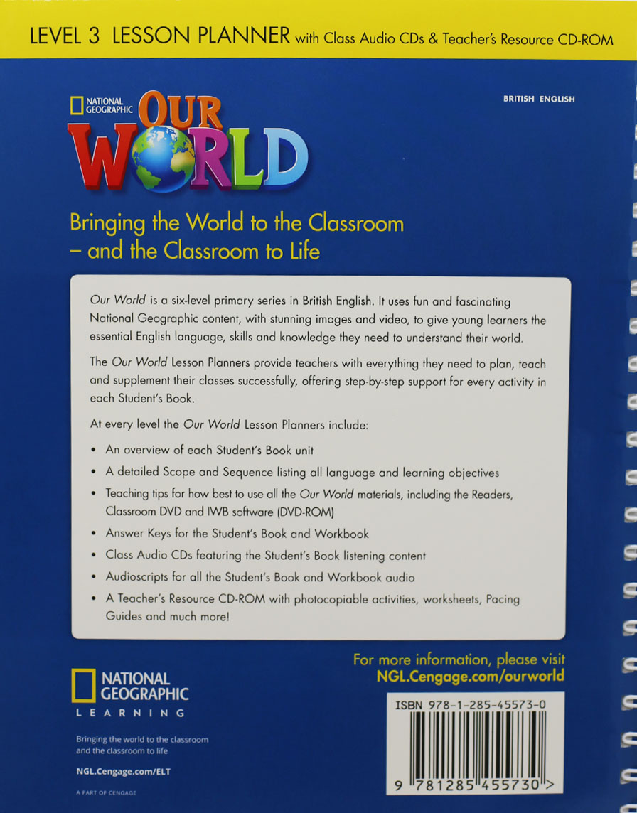 Our World is a balanced four-skills series with age-appropriate National Geographic content that motivates and excites young learners of English and helps them use English as a tool to learn about and interact with the world. Perfect for the content-rich classroom, Our World has everything students need for a balanced, four-skills curriculum, key grammar instruction, and important 21st century skills practice and cross-curricular exposure. - National Geographic video inspires and motivates young learners - Our World Readers encourage reading for fun, and bring storytelling into your classroom - Grammar support is flexible and varied with instruction and practice through the Workbooks, Grammar Workbooks, videos, and Lesson Planners - Free online activities and support are available for teachers and learners at myNGconnect.com and through the Our World Student App