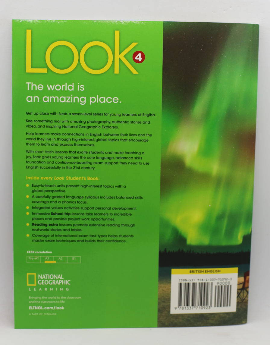 Read MoreGet up close with Look, a seven-level series for young learners of English. See something real with amazing photography, authentic stories and video, and inspiring National Geographic Explorers. Help learners make connections in English between their lives and the world they live in through high-interest, global topics that encourage them to learn and express themselves. With short, fresh lessons that excite students and make teaching a joy, Look gives young learners the core language, balanced skills foundation and confidence-boosting exam support they need to use English successfully in the 21st century. Easy-to-teach units present high-interest topics with a global perspective Carefully graded language syllabus with balanced skills coverage and a phonics focus Integrated values activities support personal development Immersive School trip lessons take learners to incredible places and provide project work opportunities Reading extra lessons promote extensive reading through real-world stories and fables Coverage of international exam task types helps students master exam techniques and builds their confidence