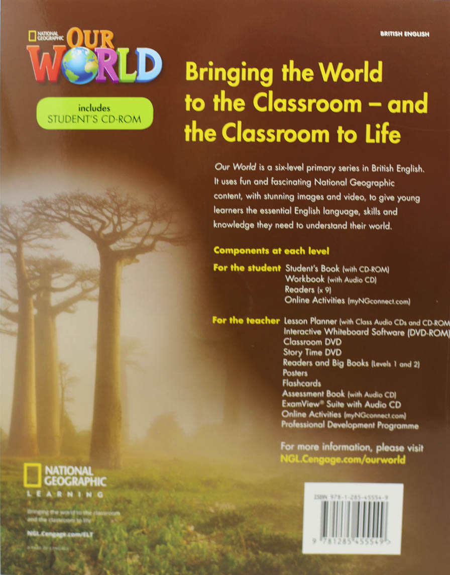 Our World is a balanced four-skills series with age-appropriate National Geographic content that motivates and excites young learners of English and helps them use English as a tool to learn about and interact with the world. Perfect for the content-rich classroom, Our World has everything students need for a balanced, four-skills curriculum, key grammar instruction, and important 21st century skills practice and cross-curricular exposure. - National Geographic video inspires and motivates young learners - Our World Readers encourage reading for fun, and bring storytelling into your classroom - Grammar support is flexible and varied with instruction and practice through the Workbooks, Grammar Workbooks, videos, and Lesson Planners - Free online activities and support are available for teachers and learners at myNGconnect.com and through the Our World Student App