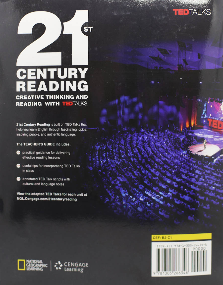 21st Century Reading was created through a partnership between TED, a nonprofit dedicated to spreading ideas through short, powerful talks and National Geographic Learning. 21st Century Reading provides the ideal forum for learners of English to make connections with topics ranging from science to business to global issues. Using TED Talks as the springboard to share ideas, this new four-level reading series shows learners how to understand and respond to ideas and content in English.