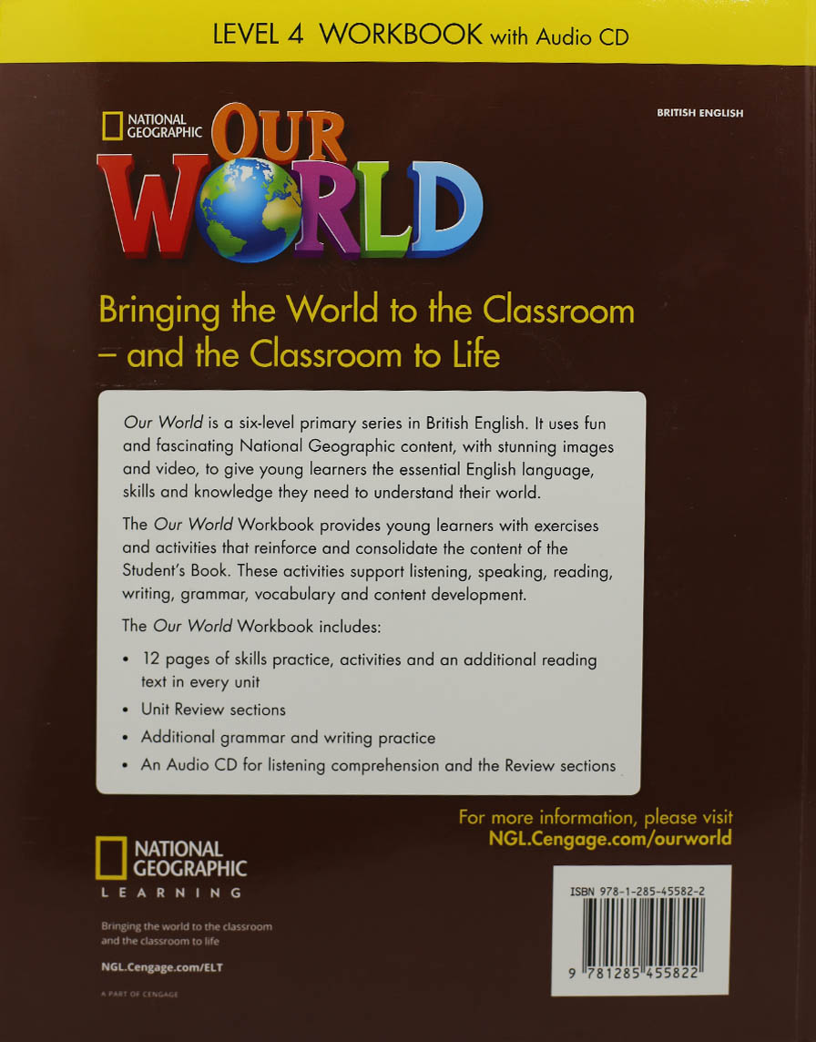 Our World is a balanced four-skills series with age-appropriate National Geographic content that motivates and excites young learners of English and helps them use English as a tool to learn about and interact with the world. Perfect for the content-rich classroom, Our World has everything students need for a balanced, four-skills curriculum, key grammar instruction, and important 21st century skills practice and cross-curricular exposure. - National Geographic video inspires and motivates young learners - Our World Readers encourage reading for fun, and bring storytelling into your classroom - Grammar support is flexible and varied with instruction and practice through the Workbooks, Grammar Workbooks, videos, and Lesson Planners - Free online activities and support are available for teachers and learners at myNGconnect.com and through the Our World Student App