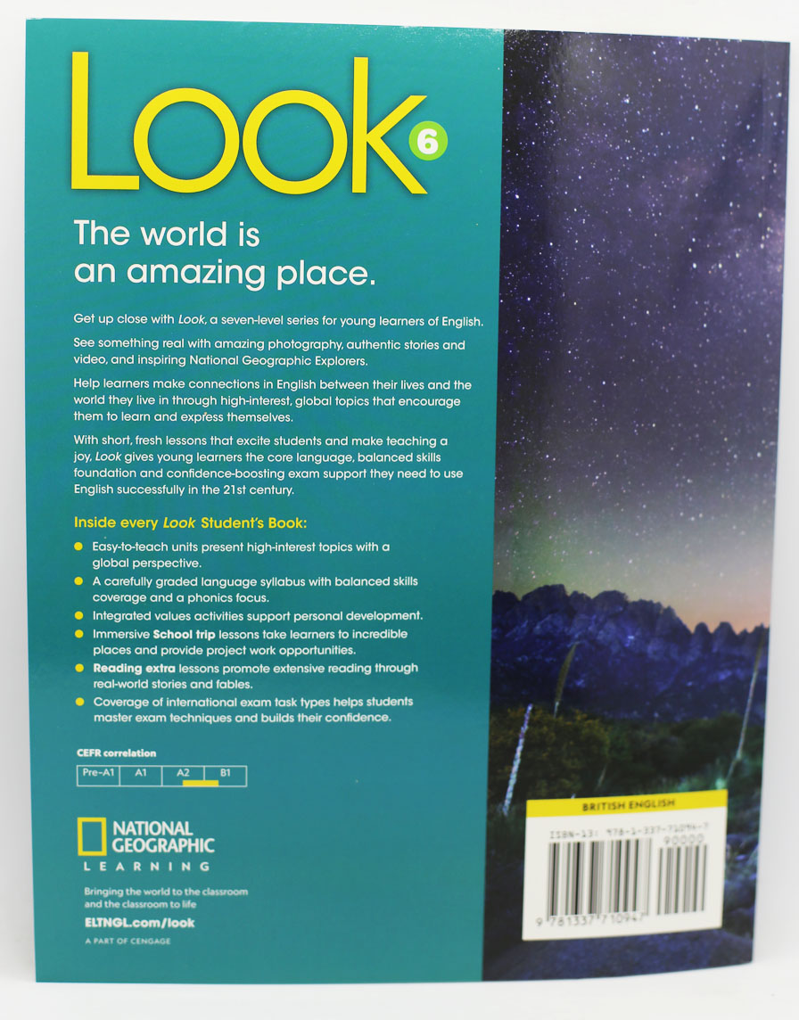 Get up close with Look, a seven-level series for young learners of English. See something real with amazing photography, authentic stories and video, and inspiring National Geographic Explorers. Help learners make connections in English between their lives and the world they live in through high-interest, global topics that encourage them to learn and express themselves. With short, fresh lessons that excite students and make teaching a joy, Look gives young learners the core language, balanced skills foundation and confidence-boosting exam support they need to use English successfully in the 21st century. Easy-to-teach units present high-interest topics with a global perspective Carefully graded language syllabus with balanced skills coverage and a phonics focus Integrated values activities support personal development Immersive School trip lessons take learners to incredible places and provide project work opportunities Reading extra lessons promote extensive reading through real-world stories and fables Coverage of international exam task types helps students master exam techniques and builds their confidence