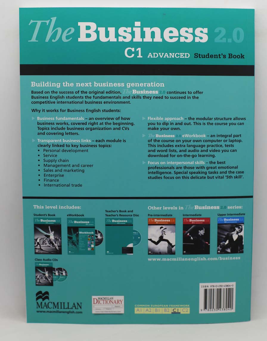 Based on the success of the original edition, The Business 2.0 continues to offer Business English students the confidence, language and fundamentals skills they need to succeed in the competitive international business environment. Based on feedback from users, research into business English studies and the ever-evolving needs of employers The Business 2.0 has been improved in a number of ways. There is a strong focus on the 'intangible' business skills - emotional intelligence and interpersonal abilities. So not only is the student prepared with the business language and knowledge but also as a well-rounded and receptive approach to dealing professionally with others. The Business eWorkbook - an integral part of the course on a personal computer or laptop. This includes extra language practice, tests and word lists, and audio and video you can download to a tablet, phone or MP3 player for on-the-go learning. This replaces the DVD-ROM from the first edition and new videos for the Advanced and Upper Intermediate level offer good/bad models for the final speaking task, including commentaries by a communications expert. This content is also available for use on a Learner Management System such as Moodle or Blackboard. This is a compact course that makes the most of new media to ensure the package is relevant for both students and teachers. Key Features / What's New - Business fundamentals - an introduction to business with language and topics including: business organization, financial control, CVs and covering letters. - Transparent business links - each module is clearly linked to either: Personal development, Service, Supply chain, Management, Sales and marketing, Enterprise, Finance, International trade - Focus on interpersonal skills - the best professionals are those with great emotional intelligence. Special speaking tasks and the case studies focus on this delicate but vital '5th skill'. - Flexible approach - the modular structure allows you to dip in and out, covering the basics or focusing on speaking or writing. This is the course you can make your own. - The Business eWorkbook - a cutting-edge self-study program to support the course with videos, extra practice and downloadables. - Builds up strength in four key areas: Language Skills: New Technologies: Business Skills: People /interpersonal skills - More communicative grammar in context