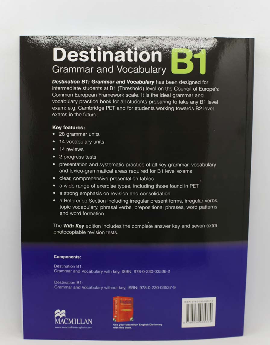 Destination Grammar has been designed for intermediate students at B1 level on the Council of Europe's Common European Framework scale. It is the ideal grammar and vocabulary practice book for all students preparing to take any B1 level exam. The book contains 28 grammar units and 14 vocabulary units covering a wide range of exercise types.