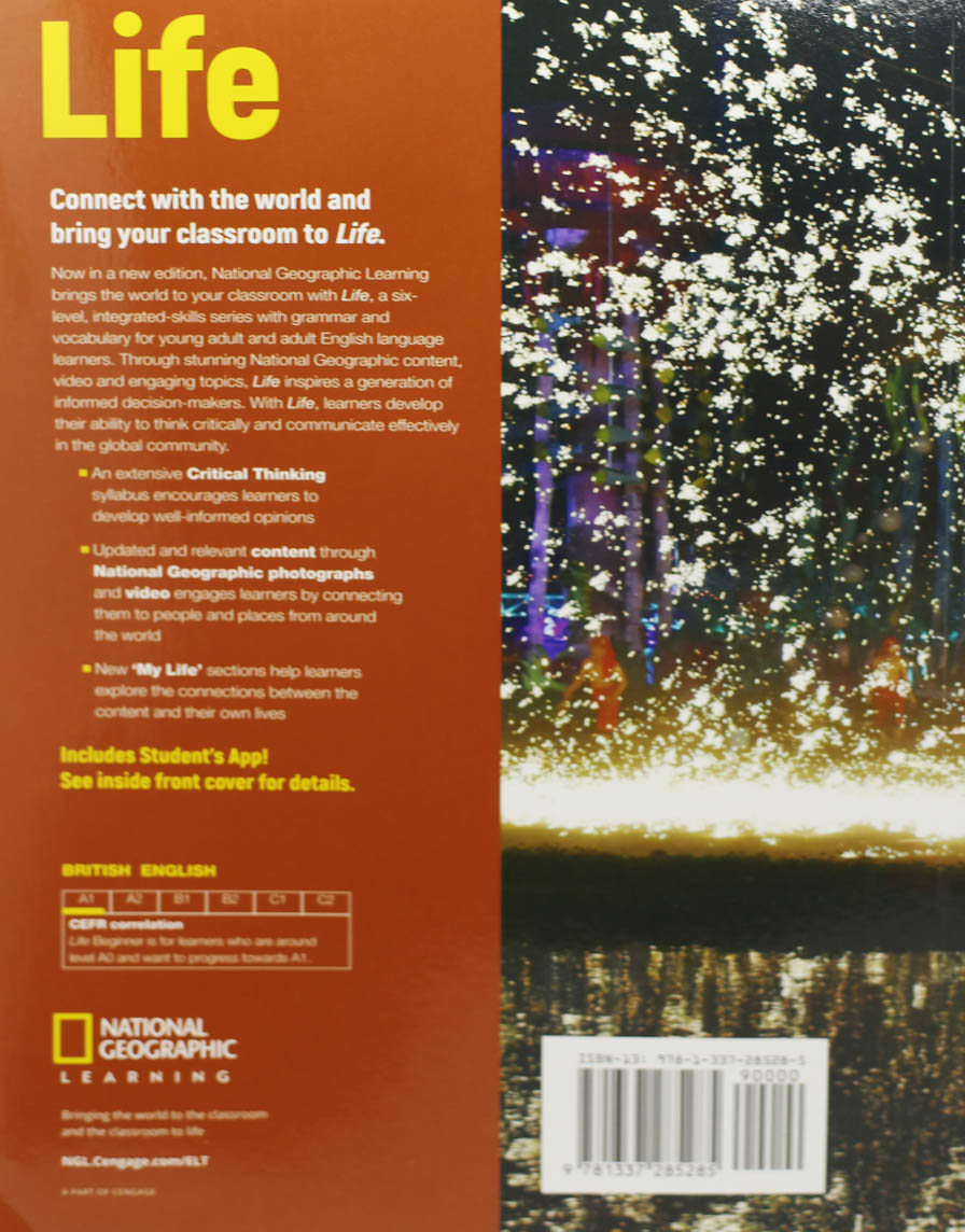 Now in a new edition+F2:F17, National Geographic Learning brings the world to your classroom with Life, a six-level integrated-skills series with grammar and vocabulary for young adult and adult English language learners. Through stunning National Geographic content, video, and engaging topics, Life inspires a generation of informed decision-makers. With Life, learners develop their ability to think critically and communicate effectively in the global community.