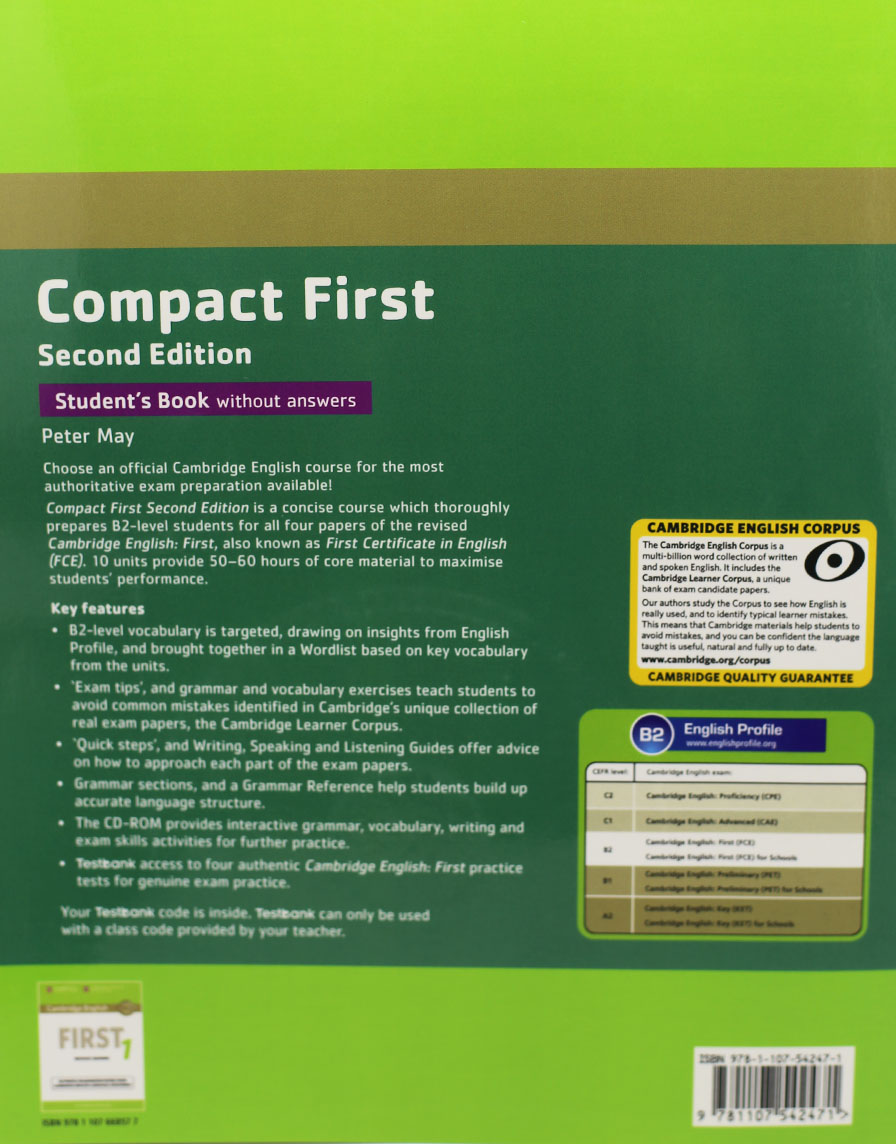 Highly focused preparation for the revised 2015 Cambridge English: First (FCE) course in 50-60 core hours. This Student's Book without answers provides B2-level students with thorough preparation and practice needed for exam success. Ten units cover all four exam papers in a step-by-step approach. 'Quick steps' and Writing, Speaking and Listening guides explain what to expect in the exam, and provide strategies on approaching each paper, model answers, useful expressions and further practice. The CD-ROM provides interactive grammar, vocabulary and writing practice. A Testbank access code for four online Cambridge English: First practice tests is included with this Student's Book.