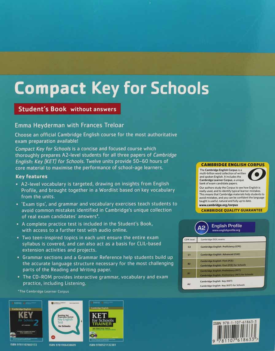 Compact Key for Schools is a focused, 50 - 60 hour course for the Cambridge English: Key (KET) for Schools exam. This Student's Book features twelve topic-based units with focused exam preparation to maximise the performance of school-age learners. Units contain pages on Reading, Writing, Listening, Speaking, Grammar and Vocabulary. A Grammar reference covers key areas in the syllabus and unit-based wordlists include target vocabulary with definitions. A Speaking Guide provides extra support for this paper. The accompanying CD-ROM provides interactive grammar, vocabulary and exam skills tasks including listening. The Student's Book includes a full practice test. A further practice test with audio is available online. Class Audio CD containing the listening material for this course is available separately.