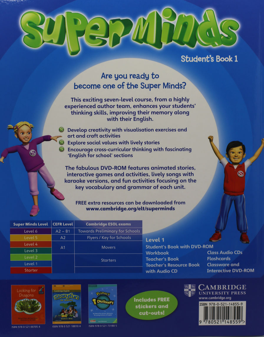 Read MoreAn exciting, seven-level course that enhances young learners' thinking skills, sharpening their memory while improving their language skills. Super Minds, from a highly experienced author team, enhances your students' thinking skills, improving their memory along with their language skills. This Level 1 Student's Book includes visualisation exercises to develop creativity, cross-curricular thinking with fascinating 'English for school' sections and lively stories that explore social values. The fabulous DVD-ROM features animated stories, interactive games and activities including videokes, lively songs with karaoke versions, and fun activities focusing on each unit's vocabulary and grammar.