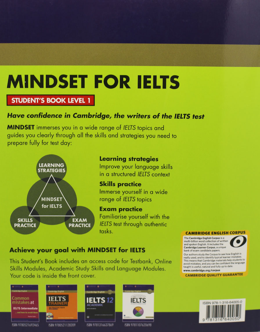 MINDSET, the multi-level course from the organisation that produces the IELTS test, develops students' English skills and leaves them fully prepared for test day. MINDSET from Cambridge gets you inside the IELTS test with a unique blend of print and online content. Topic-based units organised by skill make it easy to find what you want. Designed for students aiming for Band 5.5 in the Academic Module, this Student's Book Level 1 includes learning strategies, skills practice and exam practice to help you achieve your goal. Online content includes skills modules, Corpus informed language specific modules and Academic Study Skills, plus access to authentic online practice tests in Testbank. * Access code printed on the inside front cover.
