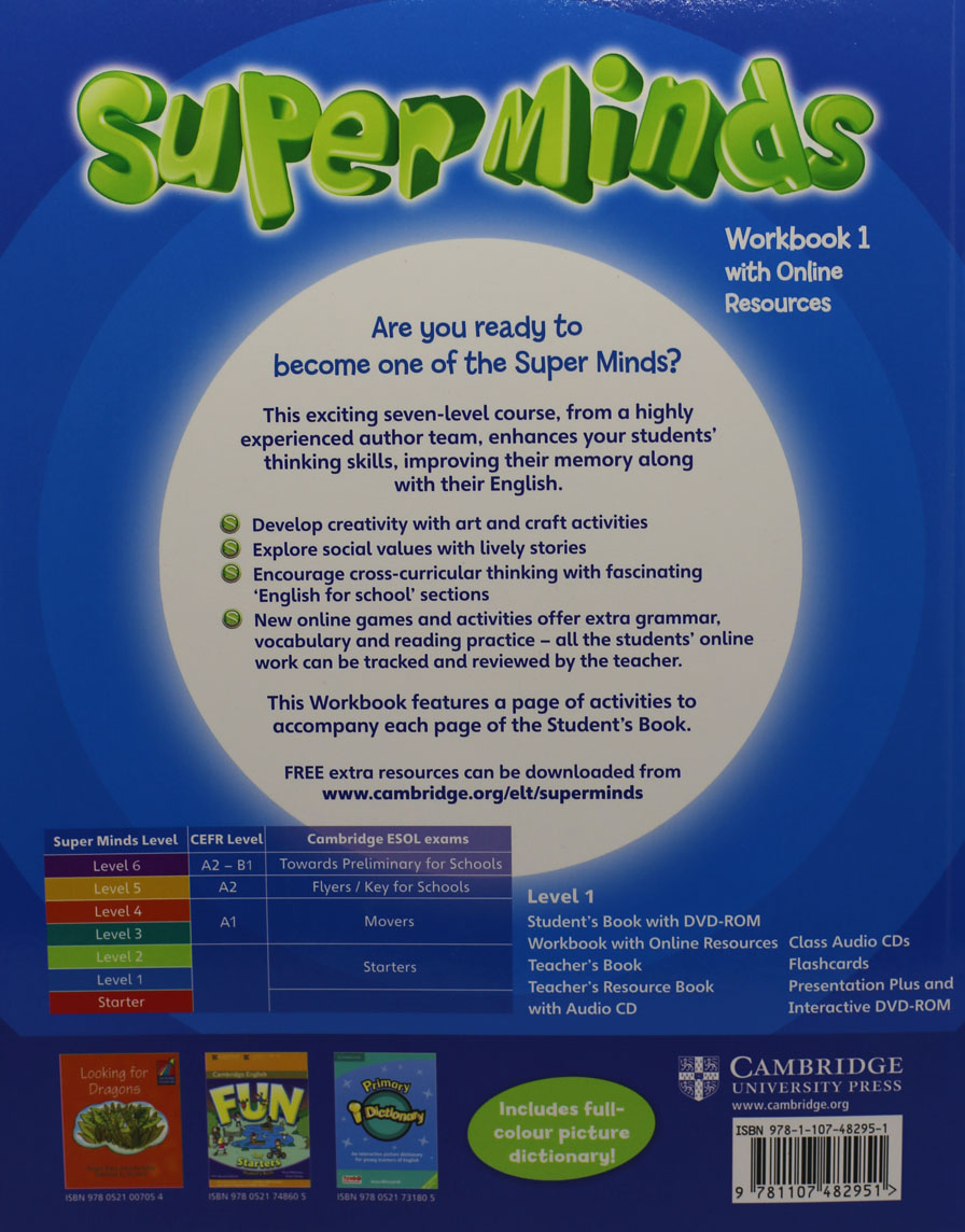 Read MoreAn exciting, seven-level course that enhances young learners' thinking skills, sharpening their memory while improving their language skills. Super Minds, from a highly experienced author team, enhances your students' thinking skills, improving their memory along with their language skills. This Level 1 Workbook includes exercises to develop creativity, cross-curricular thinking with fascinating 'English for school' sections and lively stories that explore social values. For each Student's Book page, this Workbook features a page of activities. Students also have access to an online platform with games and supplementary grammar, vocabulary and reading activities. All the students' online work can be tracked and reviewed by the teacher. Includes full-colour picture dictionary!