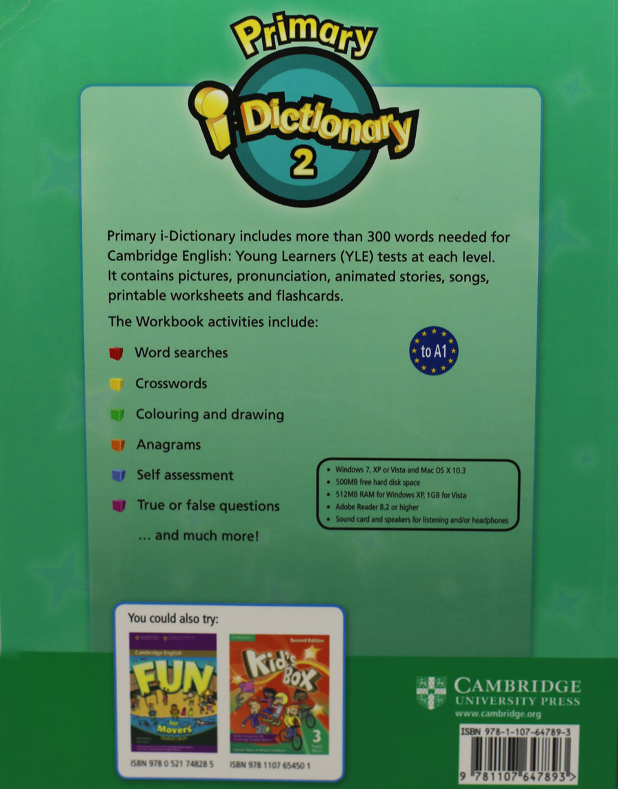 The Primary i-Dictionary Level 2 Workbook and DVD-ROM pack is ideal for general English classes as well as exam preparation. The Workbook contains all the words from the DVD-ROM plus activities. Young learners will enjoy labelling the pictures, then checking with the DVD-ROM, as well as doing crosswords, word searches, gap fills and colouring activities. The DVD-ROM contains pictures and pronunciation for the featured words in British and American English, the dictionary makes learning new vocabulary memorable and fun. The DVD-ROM is for home use. Single and multi-classroom use DVD-ROMs are also available.