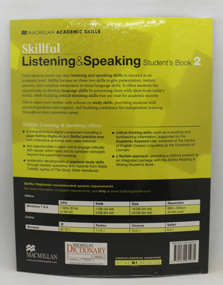 Every student needs top class reading, writing, listening and speaking skills to succeed at an academic level. Skillful focuses on each of these skills to give presentation, instant practice and complete immersion in that area of language. It offers students the opportunity to develop language skills by presenting them with ideas from today's world, while building critical thinking skills that are vital for academic success. The course takes a skills-based approach with each unit distinguishing between and global and close skills. The nature of each unit encourages students to think about the world around them, creating exciting and engaging learning material. The skills boxes that appear throughout the books signal the topic focus to the teacher, while providing the students with relevant tips, words and phrases. The study skills focus develops this further, providing students with practical guidance and support, and building confidence for independent learning throughout their university career. Key features: a comprehensive digital component including a page-faithful Digibook and Skillful practice area with interactive activities and video material. each unit provides opportunities to engage critically with issues by the texts and to consider concepts beyond the superficial meaning to develop skills such as evaluating and synthesising information systematic development of practical study skills through realistic case studies and material from Stella Cottrell, author of the bestselling title The Study Skills Handbook flexible approach, using each product as distinct individuals or together to create an integrated package of Skillful Listening & Speaking and Reading & Writing Student's Books