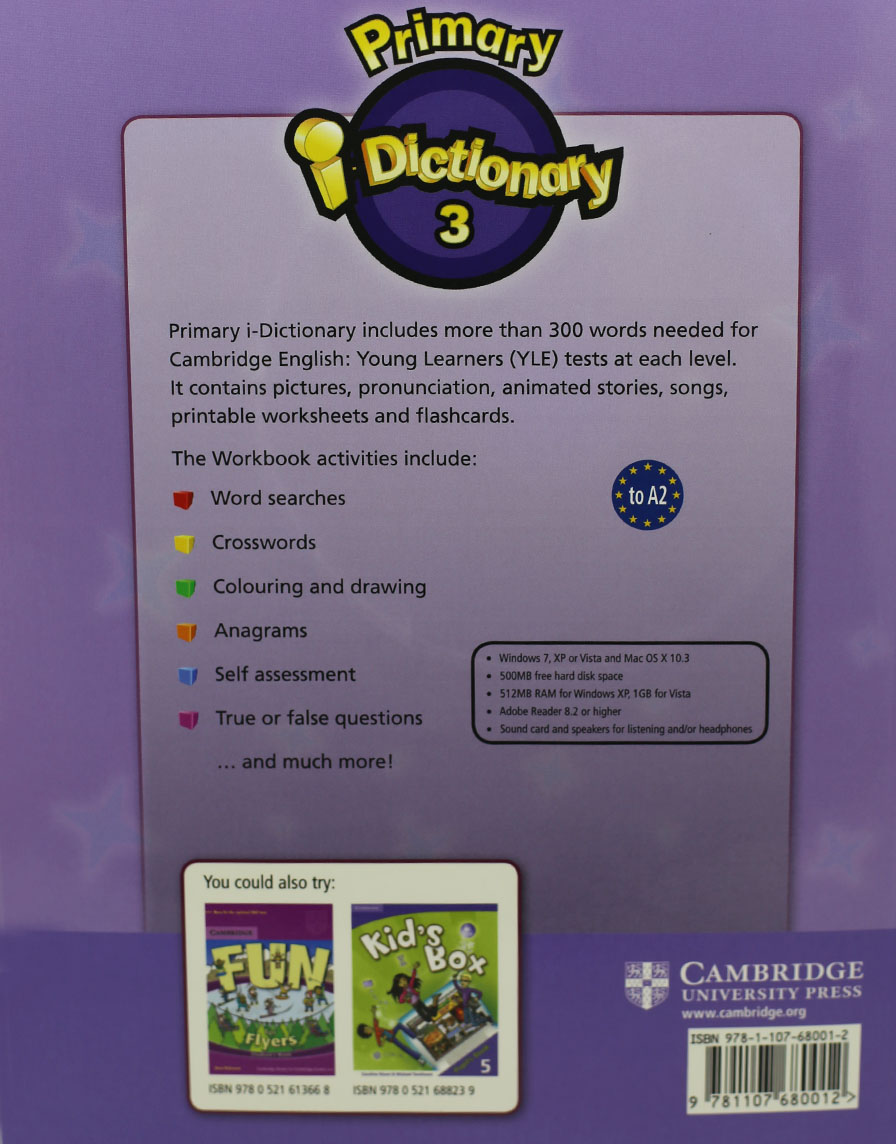 The Primary i-Dictionary Level 3 Workbook and DVD-ROM pack is ideal for general English classes as well as exam preparation. The Workbook contains all the words from the DVD-ROM plus activities. Young learners will enjoy labelling the pictures, then checking with the DVD-ROM, as well as doing crosswords, word searches, gap fills and colouring activities. The DVD-ROM contains pictures and pronunciation for the featured words in British and American English, the dictionary makes learning new vocabulary memorable and fun. The DVD-ROM is for home use. Single and multi-classroom use DVD-ROMs are also available.