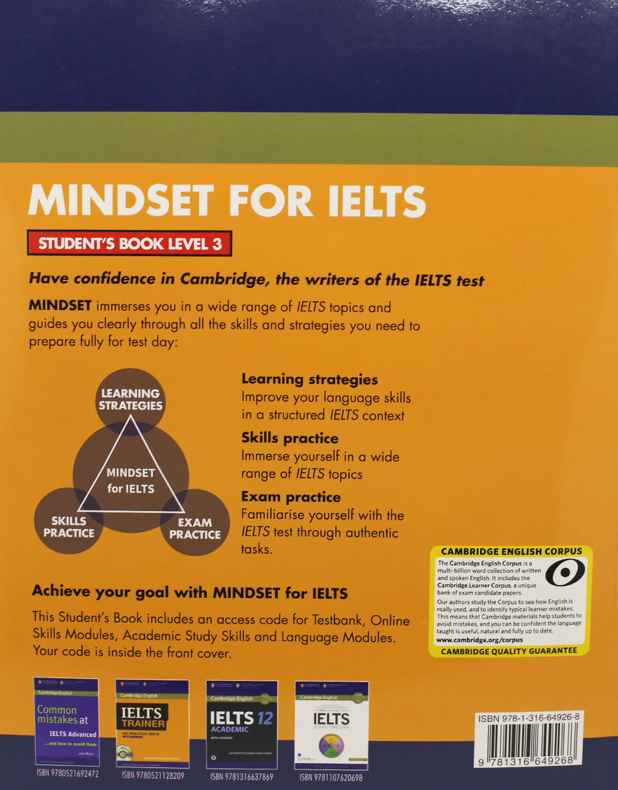 MINDSET, the multi-level course from the organisation that produces the IELTS test, develops students' English skills and leaves them fully prepared for test day. MINDSET from Cambridge gets you inside the IELTS test with a unique blend of print and online content. Topic-based units organised by skill make it easy to find what you want. Designed for students aiming for Band 7.5 in the Academic Module, this Student's Book Level 3 includes learning strategies, skills practice and exam practice to help you achieve your goal. Online content includes skills modules, Corpus informed language specific modules and Academic Study Skills, plus access to authentic online practice tests in Testbank. *Access code printed on the inside front cover.