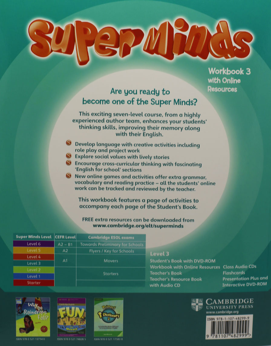 Read MoreAn exciting, seven-level course that enhances young learners' thinking skills, sharpening their memory while improving their language skills. Super Minds enhances your students' thinking skills, improving their memory along with their language skills. This Level 3 Workbook includes exercises to develop language creatively, cross-curricular thinking with fascinating 'English for school' sections and lively stories that explore social values. For each Student's Book page, this Workbook features a page of activities. Students also have access to an online platform with games and supplementary grammar, vocabulary and reading activities. All the students' online work can be tracked and reviewed by the teacher.