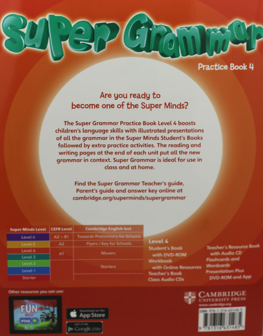 Read MoreAn exciting, seven-level course that enhances young learners' thinking skills, sharpening their memory while improving their language skills. The Super Grammar Book Level 4 boosts children's language skills with illustrated presentations of all the grammar in the Student's Books followed by extra practice activities. The reading and writing pages at the end of each unit put all the new grammar in context. Super Grammar is ideal for use in class and at home. Find the Super Grammar Teacher's guide, Parent's guide and answer key online at cambridge.org/superminds