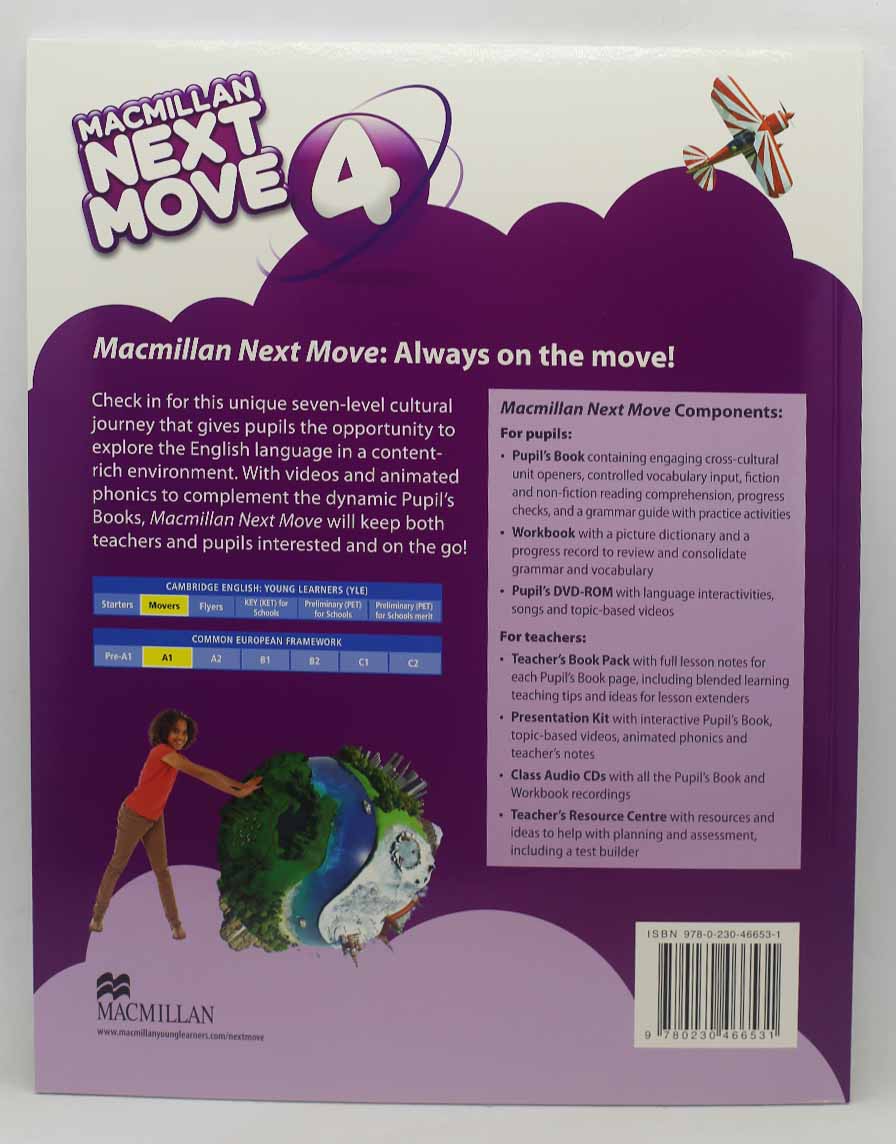 Macmillan Next Move British English Workbooks provide substantial support for the Pupil's Book and enable learners to develop their language skills both in the classroom and at home through homework. The country topics are sustained throughout the Workbook units reinforcing the realistic contexts and cross-cultural experience.