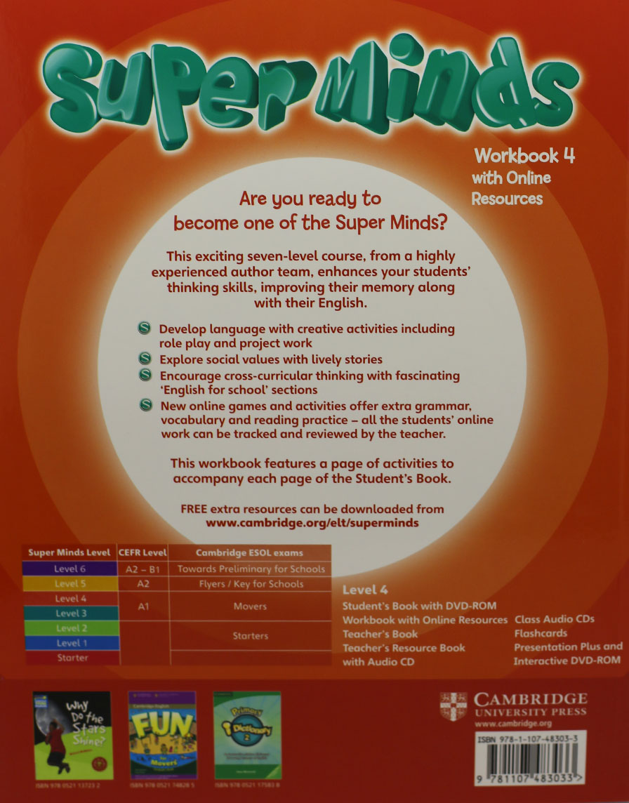 Read MoreAn exciting, seven-level course that enhances young learners' thinking skills, sharpening their memory while improving their language skills. Super Minds enhances your students' thinking skills, improving their memory along with their language skills. This Level 4 Workbook includes activities to develop language creatively, cross-curricular thinking with fascinating 'English for school' sections and lively stories that explore social values. For each Student's Book page, this Workbook features a page of activities. Students also have access to an online platform with games and supplementary grammar, vocabulary and reading activities. All the students' online work can be tracked and reviewed by the teacher.