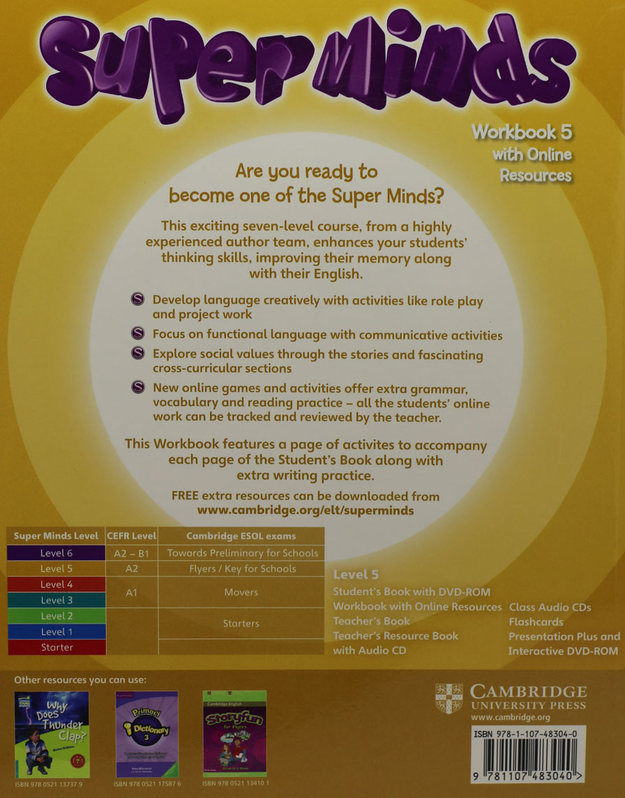 Read MoreAn exciting, seven-level course that enhances young learners' thinking skills, sharpening their memory while improving their language skills. Written by a highly experienced author team, Super Minds enhances your students' thinking skills, improving their memory along with their language skills. This Level 5 Workbook includes activities to develop language creatively, fascinating cross-curricular sections and lively stories that explore social values. For each Student's Book page, this Workbook features a page of activities. Students also have access to an online platform with games and supplementary grammar, vocabulary and reading activities. All the students' online work can be tracked and reviewed by the teacher.