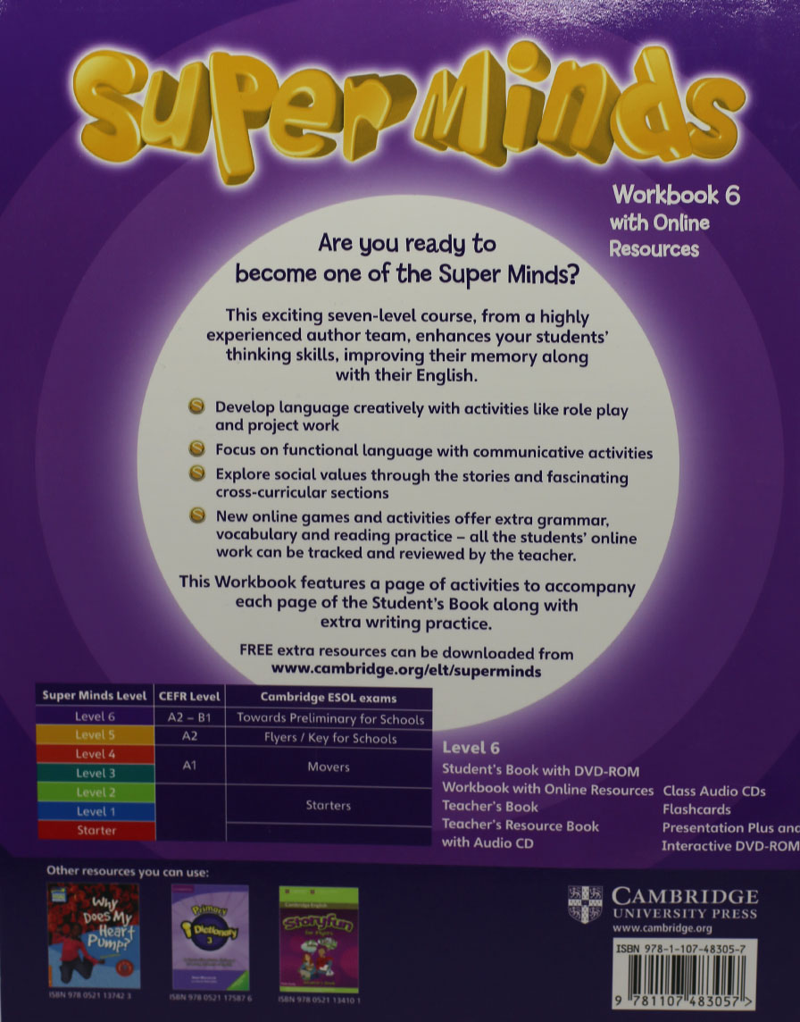 Read MoreAn exciting, seven-level course that enhances young learners' thinking skills, sharpening their memory while improving their language skills. Written by a highly experienced author team, Super Minds enhances your students' thinking skills, improving their memory along with their language skills. This Level 6 Workbook includes activities to develop language creatively, fascinating cross-curricular sections and lively stories that explore social values. For each Student's Book page, this Workbook features a page of activities. Students also have access to an online platform with games and supplementary grammar, vocabulary and reading activities. All the students' online work can be tracked and reviewed by the teacher.