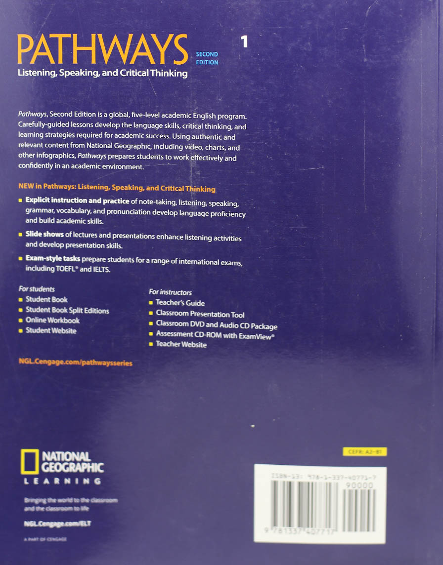 Pathways, Second Edition, is a global, five-level academic English program. Carefully-guided lessons develop the language skills, critical thinking, and learning strategies required for academic success. Using authentic and relevant content from National Geographic, including video, charts, and other infographics, Pathways prepares students to work effectively and confidently in an academic environment.