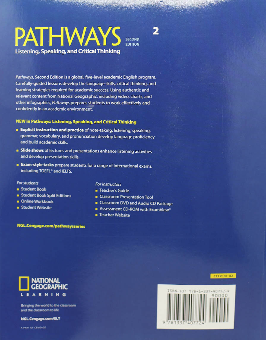 Pathways, Second Edition, is a global, five-level academic English program. Carefully-guided lessons develop the language skills, critical thinking, and learning strategies required for academic success. Using authentic and relevant content from National Geographic, including video, charts, and other infographics, Pathways prepares students to work effectively and confidently in an academic environment.
