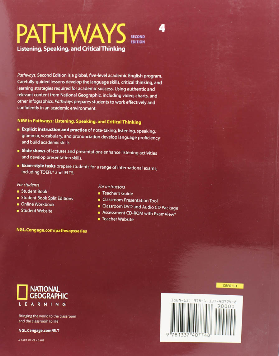 Pathways, Second Edition, is a global, five-level academic English program. Carefully-guided lessons develop the language skills, critical thinking, and learning strategies required for academic success. Using authentic and relevant content from National Geographic, including video, charts, and other infographics, Pathways prepares students to work effectively and confidently in an academic environment.
