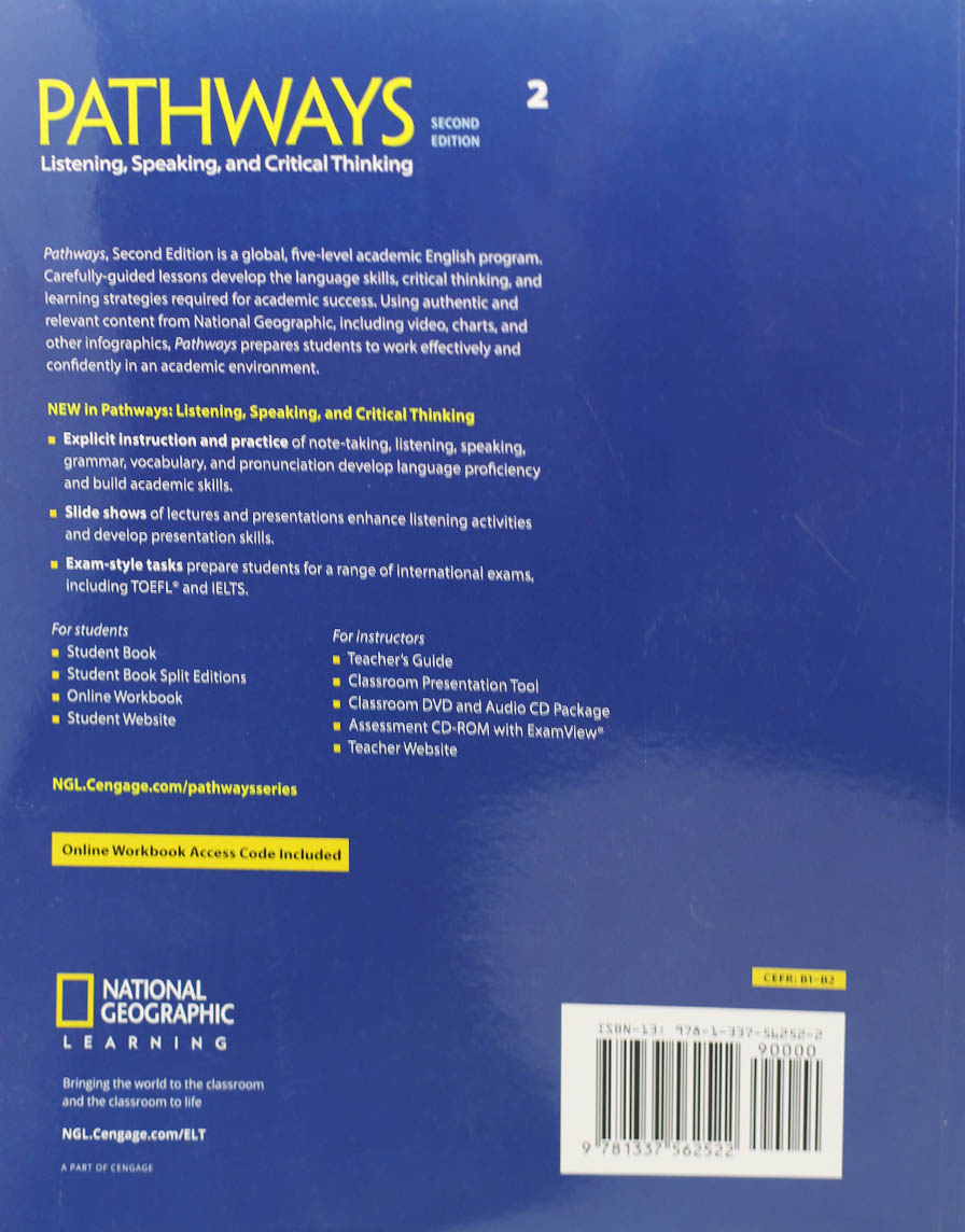 Pathways, Second Edition, is a global, five-level academic English program. Carefully-guided lessons develop the language skills, critical thinking, and learning strategies required for academic success. Using authentic and relevant content from National Geographic, including video, charts, and other infographics, Pathways prepares students to work effectively and confidently in an academic environment.