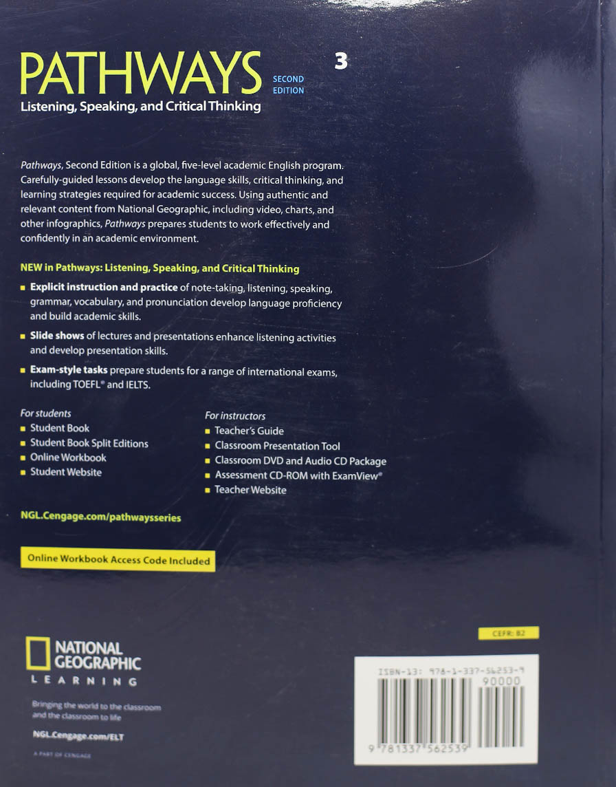 Pathways, Second Edition, is a global, five-level academic English program. Carefully-guided lessons develop the language skills, critical thinking, and learning strategies required for academic success. Using authentic and relevant content from National Geographic, including video, charts, and other infographics, Pathways prepares students to work effectively and confidently in an academic environment.