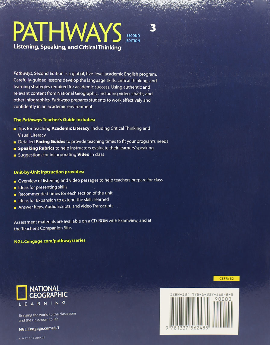Pathways, Second Edition, is a global, five-level academic English program. Carefully-guided lessons develop the language skills, critical thinking, and learning strategies required for academic success. Using authentic and relevant content from National Geographic, including video, charts, and other infographics, Pathways prepares students to work effectively and confidently in an academic environment.