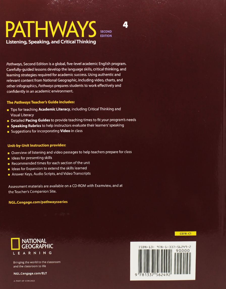 Pathways, Second Edition, is a global, five-level academic English program. Carefully-guided lessons develop the language skills, critical thinking, and learning strategies required for academic success. Using authentic and relevant content from National Geographic, including video, charts, and other infographics, Pathways prepares students to work effectively and confidently in an academic environment.