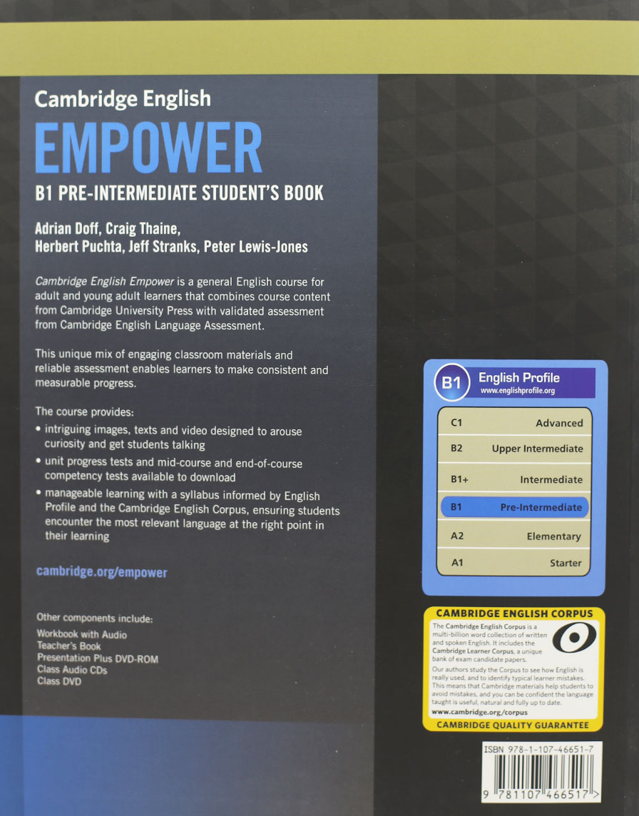 Cambridge English Empower is a general adult course that combines course content from Cambridge University Press with validated assessment from the experts at Cambridge English Language Assessment. The Pre-intermediate Student's Book gives learners an immediate sense of purpose and clear learning objectives. It provides core grammar and vocabulary input alongside a mix of skills. Speaking lessons offer a unique combination of functional language, pronunciation and conversation skills, alongside video filmed in the real world. Each unit ends with a consolidation of core language from the unit and focuses on writing within the context of a highly communicative mixed-skills lesson. This version of the Student's Book does not provide access to the video, assessment package and online workbook. A version with full access is available separately.